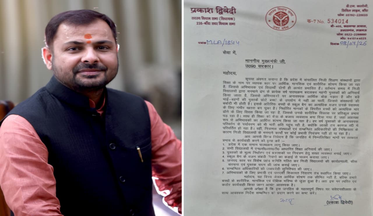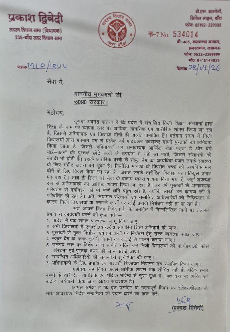 बांदा। सदर विधानसभा के विधायक प्रकाश द्विवेदी ने राज्य में संचालित निजी शिक्षण संस्थानों द्वारा छात्रों और उनके अभिभावकों पर डाले जा रहे आर्थिक,शारीरिक एवं मानसिक दबाव को लेकर चिंता जताते हुए मुख्यमंत्री को पत्र लिखकर सख्त कार्रवाई की मांग की है। उन्होंने शिक्षा के क्षेत्र में निजी संस्थानों द्वारा किए जा रहे “मनमाने व्यवहार” को समाज के लिए गंभीर समस्या बताया और त्वरित कार्रवाई का आह्वान किया।